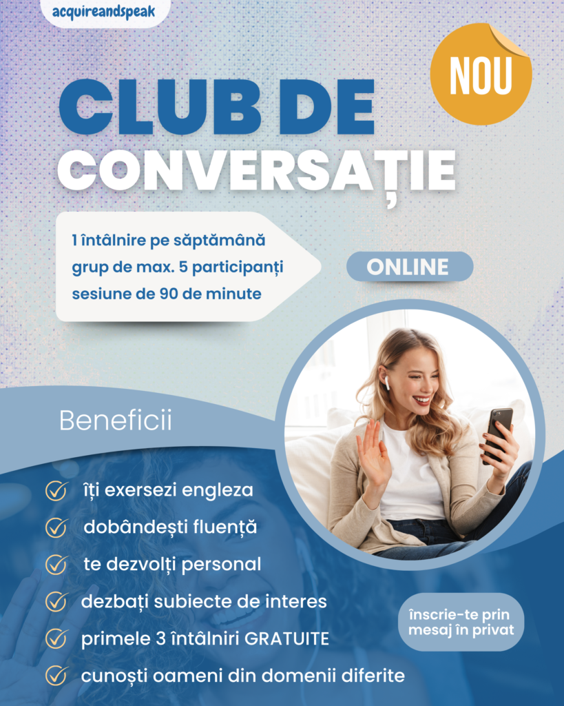 Dacă ai un nivel mediu la limba engleză și vrei să-ți exersezi engleza sau vrei să vezi cum e să vorbești cu alte persoane din alte domenii de activitate, clubul de conversație este potrivit pentru tine.